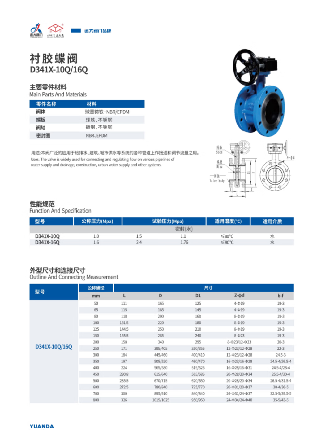 商品名称:远大 涡轮铸铁法兰衬胶蝶阀 D341X-16Q DN100 PN16